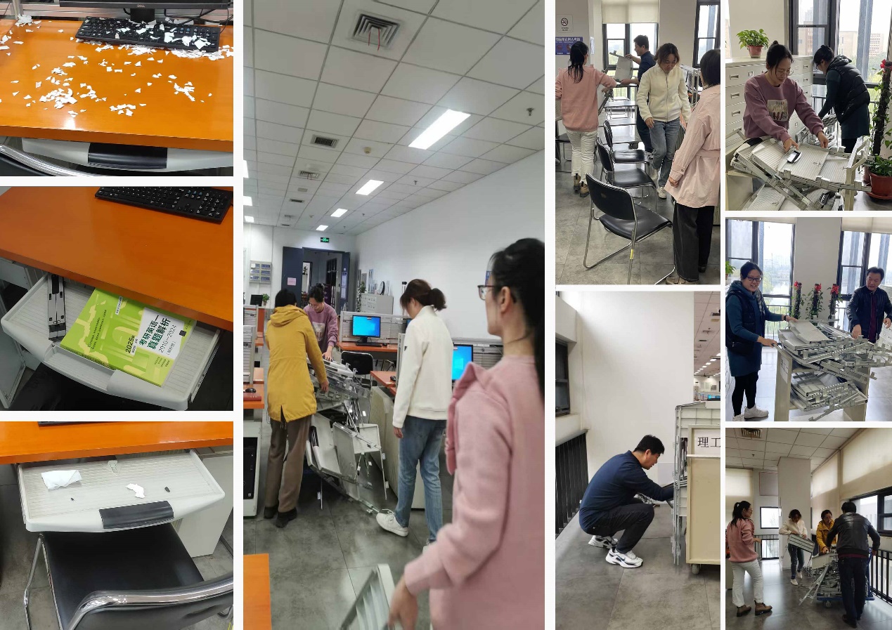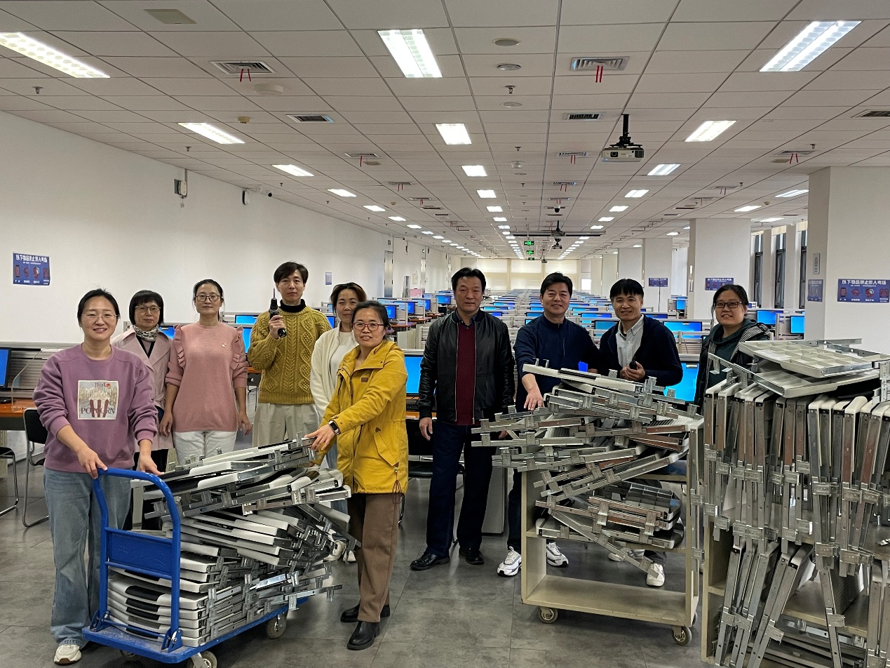 电子阅览室是师生开展数字化学习的重要场所,然而,其中部分设备配备的老旧键盘托盘,在长期使用后出现了诸多问题,如托盘松动、积满灰尘且杂物堆积。这些问题不仅降低了师生的使用感受,也为环境清洁维护增添了难度,甚至存在一定的安全隐患。为了有效解决这一现实难题,两个党支部积极作为、迅速响应,将更换老旧键盘托盘列为党员实践活动的重点任务。在活动过程中,党员同志们充分发挥先锋模范带头作用,分工明确、配合默契,有条不紊地开展拆卸、规整和清运工作。大家不惧脏累,认真拆除每一个老旧托盘,仔细清理设备缝隙里的灰尘和杂物,以实际行动为师生营造了一个整洁有序的阅览环境。