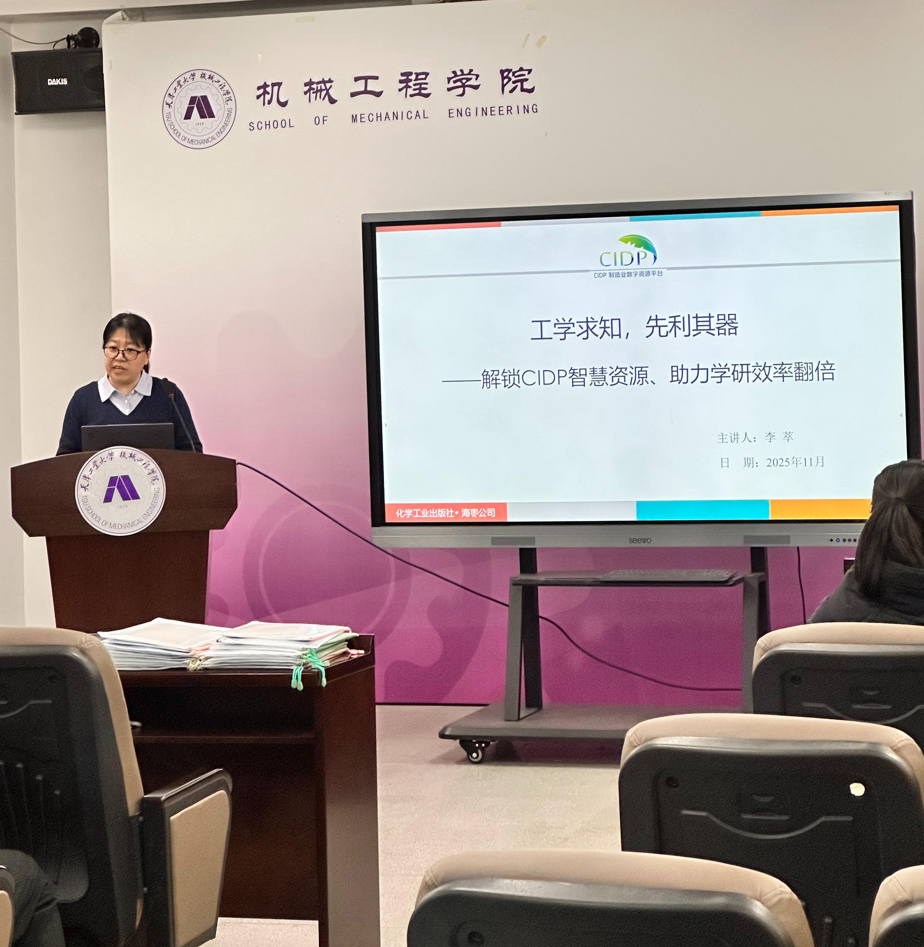 为深化专业数字资源服务,助力我校工学相关学科的教学与科研工作,2025年11月20日下午,图书馆在机械工程学院报告厅成功举办了“工学求知、先利其器——解锁CIDP智慧资源、助力学研效率翻倍”主题讲座。本次讲座由信息部董永梅副研究馆员主持,特邀化学工业出版社李萃副编审担任主讲,机械工程学院多名师生到场参加。