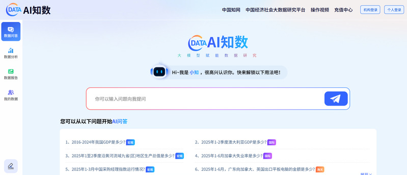《AI知数》产品是基于中国知网自主调试开发的“统计数据大模型”,辅助实现“查数据”与“用数据”的智能化与自动化,其核心价值是“大模型赋能数据研究”。平台可以智能化的实现统计数据的数据问答、数据分析、数据解读、生成数据分析报告等,能够为目标用户提供有价值的数据支持和洞察分析。